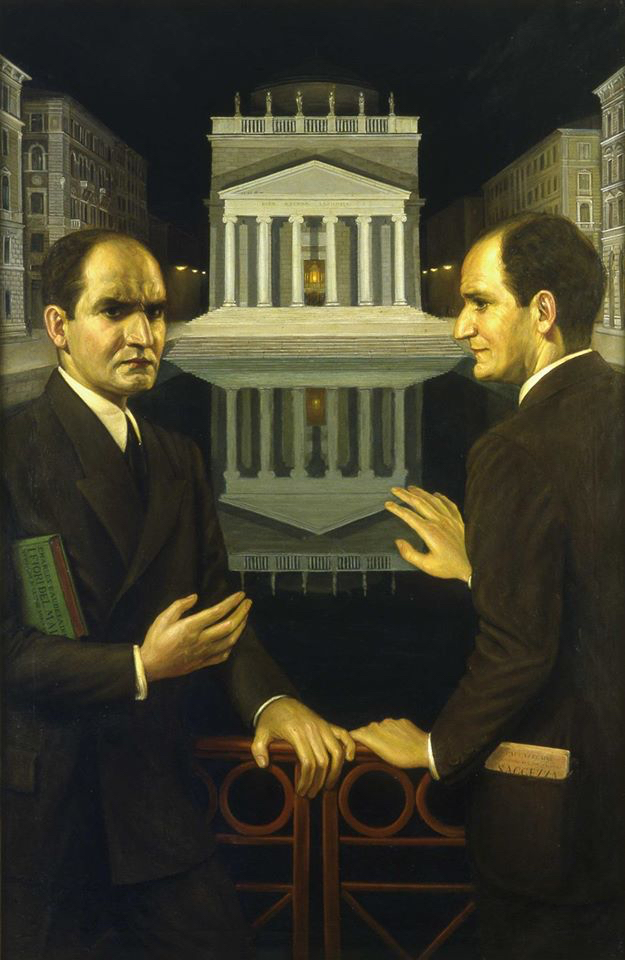Il nostro alter ego si incontra in un sogno o in uno specchio. Cesare Sofianopulo aveva un’attrazione fatale per l’autoritratto e, nel dipinto, lo vediamo stagliarsi sul Canal Grande di Trieste accanto al suo doppio. Colpo di genio: anche il mondo si duplica e, in un gioco di riflessi, la chiesa di Sant’Antonio Taumaturgo si raddoppia. Non sfugga il dettaglio letterario: sotto braccio l’artista – o il suo Doppelgänger, quale dei due? – esibisce i Fiori del Male di Charles Baudelaire.