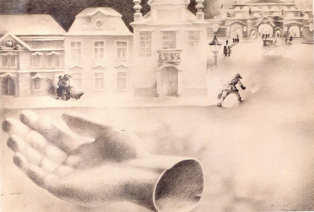Max Klinger, nel 1881, pubblica una serie di incisioni dal titolo Il Guanto. Il giovanissimo Giorgio Carmelich riprende l’idea narrativa in un’immagine onirica nella quale la mano vuota fluttua sulla Mitteleuropa scomparsa. Manlio Malabotta, allora critico avvedutissimo, colse per primo il ruolo innovativo ricoperto da Carmelich nel contesto triestino: