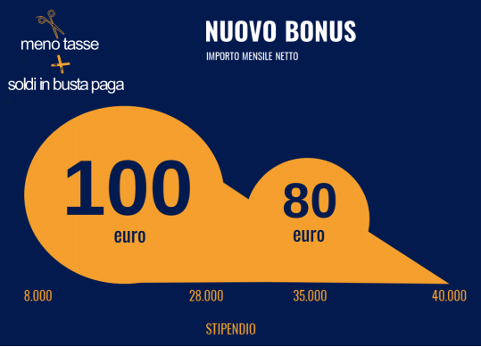 – per i dipendenti che hanno un reddito annuo da 8.173,00 fino a 28.000,00 l’innalzamento della misura mensile del bonus passa da 80 a 100 euro ;